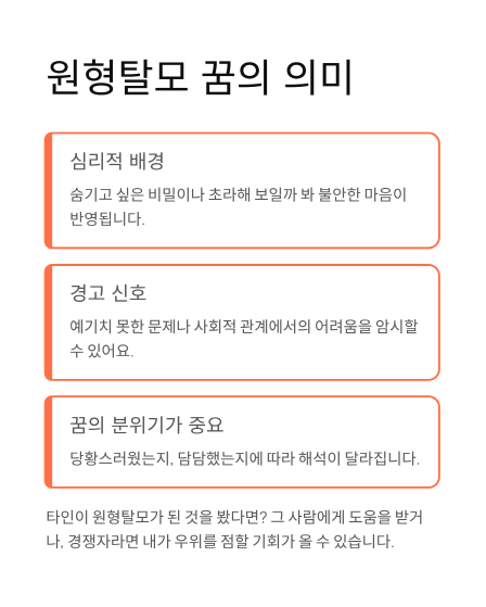 꿈속에서 아예 대머리가 되어버렸거나 부분적으로 휑한 원형탈모 꿈을 꾸었다면, 이는 사회적 이미지의 타격을 우려하는 심리가 강하게 작용하고 있는 거예요. 내가 숨기고 싶은 비밀이 드러날까 봐 걱정하거나, 남들에게 비춰지는 내 모습이 초라해 보일까 봐 불안해할 때 자주 나타나죠. 특히 대머리꿈은 집안에 근심이 생기거나 사업상 예기치 못한 암초를 만날 수 있다는 의미로도 쓰여요.