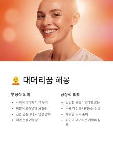 - 대머리꿈: 체면 손상이나 심한 스트레스를 의미하지만, 시원했다면 근심 해결!