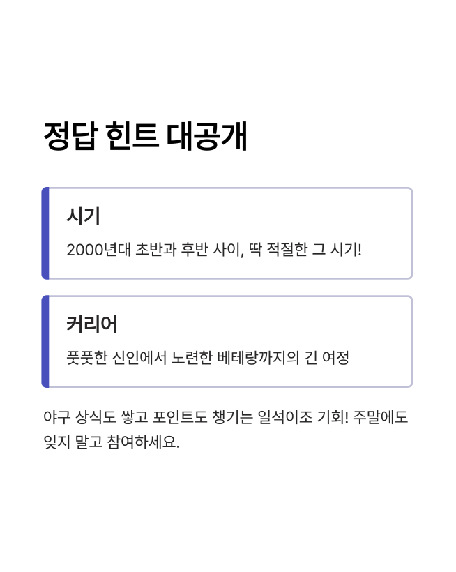 힌트를 살짝 드리자면, 2000년대 초반과 후반 사이 딱 적절한 그 시기랍니다! 과연 김진성 선수의 위대한 여정이 시작된 그 해는 언제일까요? 정답은 포스팅 하단에 연결된 링크를 통해 실시간으로 확인하실 수 있으니 참고해 주세요. 주말에도 잊지 말고 쏠퀴즈 참여해서 포인트 혜택 꼭 받아 가시길 바랍니다.