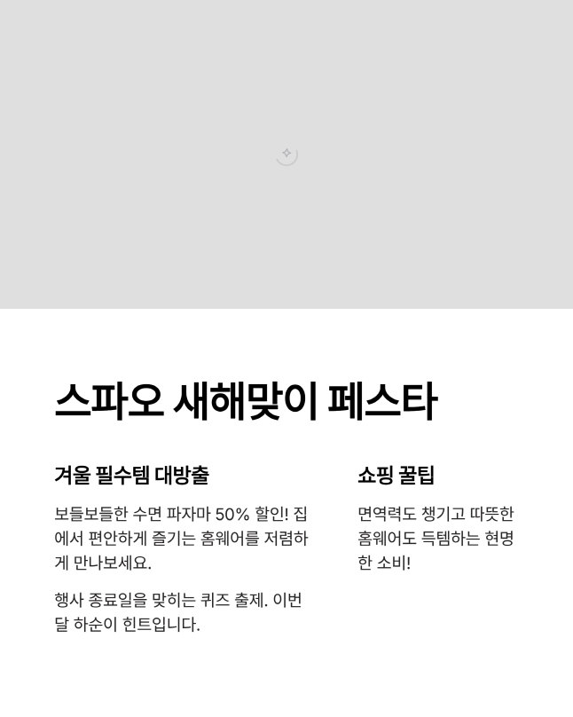여기에 패션 아이템 득템 기회도 빠질 수 없죠! 스파오에서 진행하는 새해맞이 페스타 소식인데요. 겨울철 필수템인 보들보들한 수면 파자마를 50%나 할인한다고 하니, 저처럼 집순이·집돌이 생활을 즐기시는 분들에게는 최고의 소식이 아닐까 싶어요. 이번 행사가 언제 종료되는지 날짜를 맞히는 문제가 나왔는데, 쇼핑 계획 있으신 분들은 이 날짜를 꼭 체크해두셔야 할 것 같아요. 정답 힌트는 이번 달 하순 어느 날이랍니다!